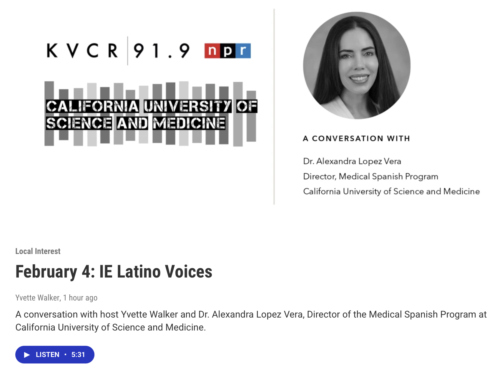 Media: KVCR- IE Latino Voices Región de Murcia Universal - Book Scientific American Región de Murcia - Acción Exterior Región de Murcia - Acción Exterior Woman of the Year 2025 MedEdge - Ep.7 | Language, Culture, and Care: Adapting to Changing Demographics with Alexandra Lopez-Vera, PhD MPH Podcasts: Industry Chat w/ Dr. Lopez Vera @ CUSM, California University School of Medicine Awards: Allied Healthcare Professional of the Year - National Hispanic of Medical Association Latina Advocate by Senator Eloise Gomez-Reyes - HOPE Heritage Month Honoree: Joe Baca Jr. Fifth District Supervisor Latina Executive of the Year Award - NLWA-IE Latinicima - Hispanic Coalition of Small Business